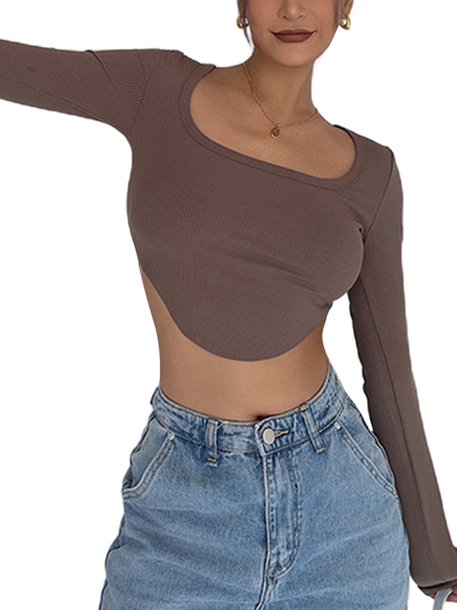 Inevnen Women S Ruched Ribbed Square Neck Long Sleeve Crop Tee Shirt Top Walmart Com